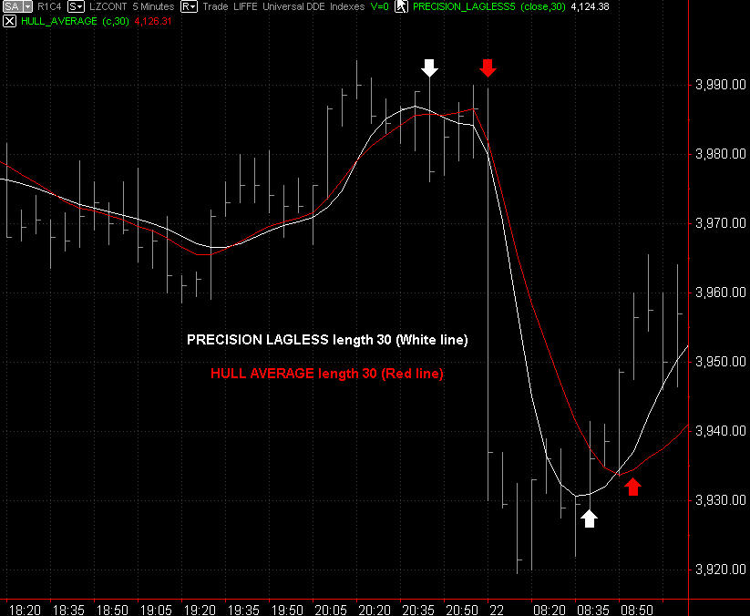 The diagram below shows the immense speed difference on a 30 period PLA and 30 period Hull average. The PLA was four bars ahead of the Hull average on both major turning points indicated on the 5 minute chart of the FT-SE100 Future ( Which is a 14%+ difference in Lag).